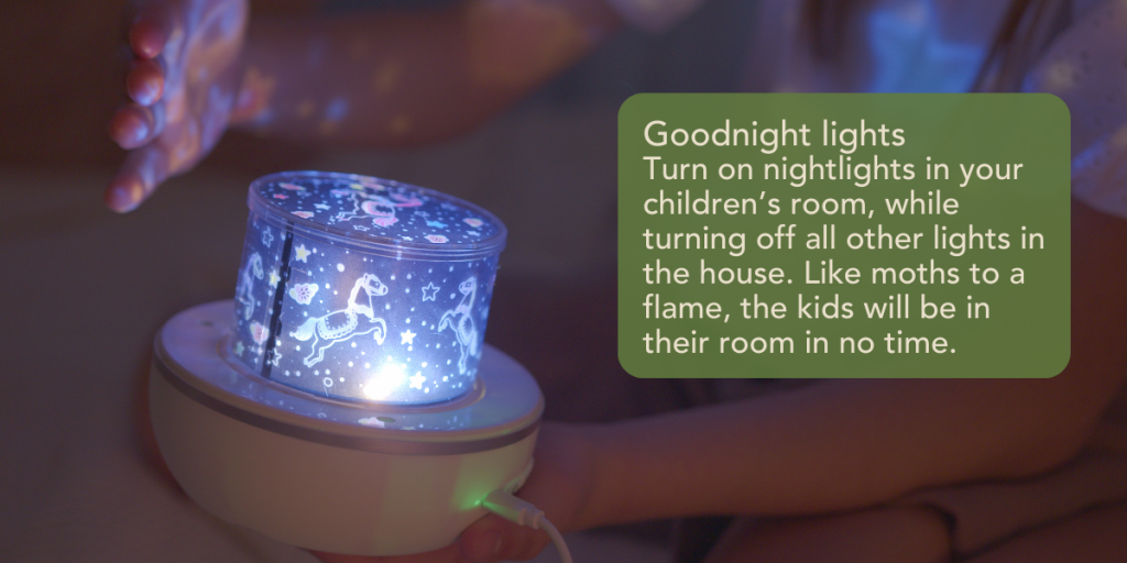 Trouble getting the kids off to bed? Switch a small lamp or night light on in the kid’s bedrooms, then start turning all the other lights off in the house. Like moths to a flame, they’ll be snug as bugs in the bed in no time.