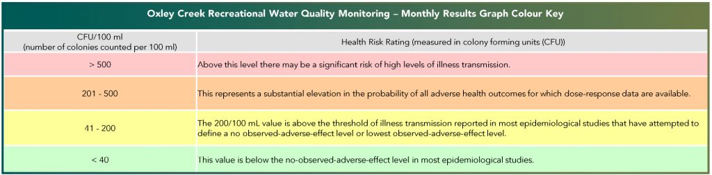 The water quality monitoring program results provide an indication of the potential risks to human health associated with the presence of varying levels of microbial contamination within the creek water.  The presence of microbial contamination is common in urban waterways, and levels can vary on a daily basis. These changes in level may affect recreational use of the creek as contact with the water could pose a health risk.