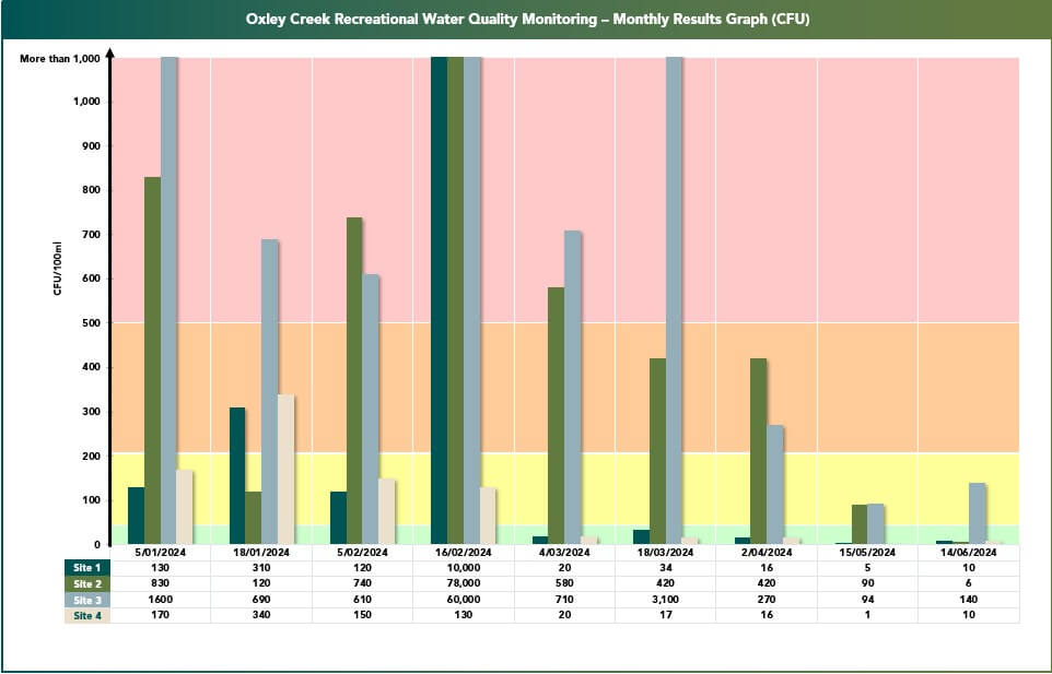 Monthly creek water sampling is undertaken at four locations along Oxley Creek: