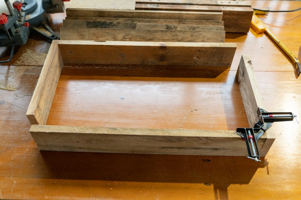 Start by positioning a side and front piece at a right angle to each other. A clamp may help you keep the piece’s steady while you screw/nail them together (remember to pre-drill the holes if using screws). Set aside and repeat. Join the two L-shaped pieces together to form a rectangle frame.
