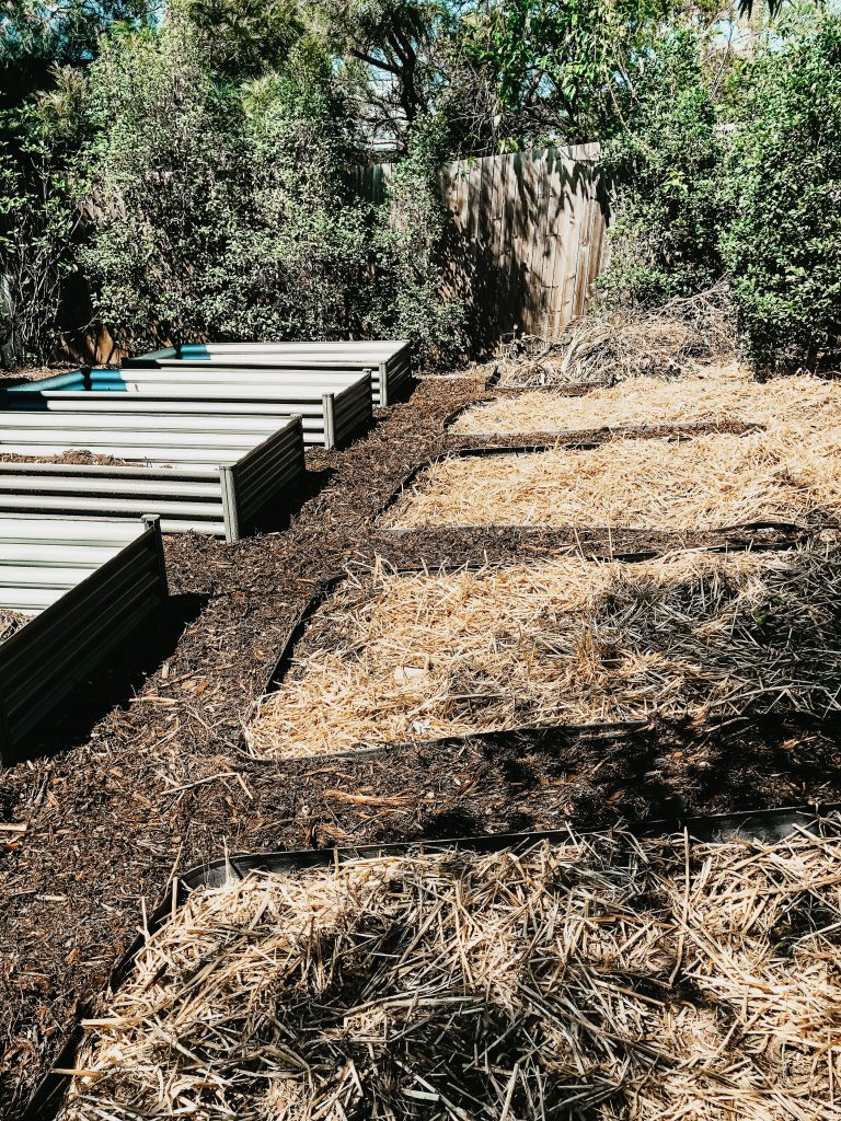 No-dig garden beds will save you time, energy and money and will set your plants up for success. We set out to get rid of every piece of grass we could see! We covered the entire patch with a thick layer of wet cardboard with boxes we collected from friends and family. We marked out where our beds, paths and play areas would be. The paths were cardboard covered with 20cm of forest mulch and the garden beds were layers of leaves and branches, sugar cane mulch, cow and chicken manure, borage and comfrey leaves, compost and rock minerals all watered in well with an organic seaweed solution to promote decomposition and microbial activity. A final layer of wet newspaper went on top of our compost to keep weeds out and a thick layer of sugar can mulch was placed on top.